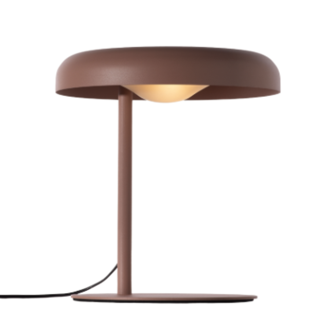 Lámpara de mesa de luz semi directa. Pantalla en aluminio. Difusor de metacrilato esmerilado. Cable eléctrico blanco o negro con interruptor on/off.
